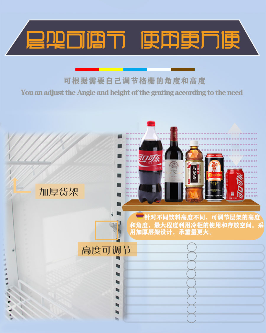 ★多層擱板角度可調(diào)??筛鶕?jù)根據(jù)賣場要求調(diào)節(jié)不同的展示效果。
